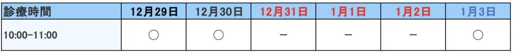 2025-26年末年始は12/29, 30, 1/3の10:00-11:00に臨時診療を行います。